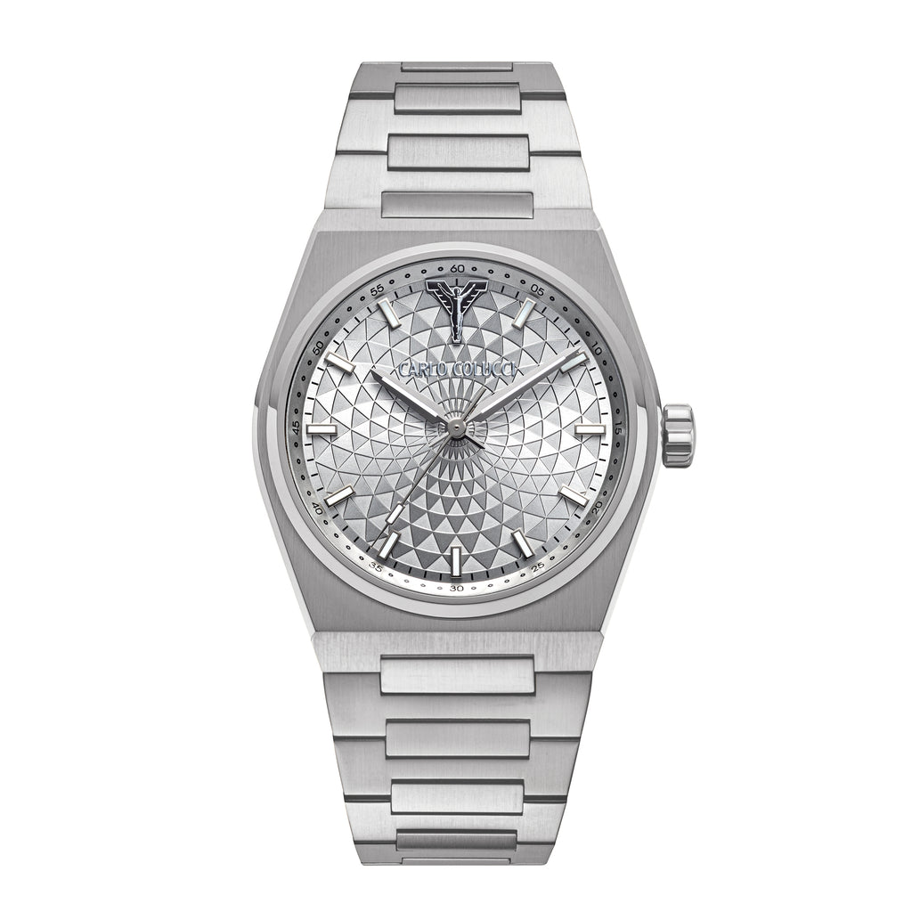 Das eckige Edelstahlgehäuse in Kombination mit dem massiven Edelstahlarmband verleiht der Uhr eine klare, maskuline Präsenz. Mit einer Wasserdichtigkeit von 5 ATM ist sie optimal für den täglichen Einsatz konzipiert – stilvoll, belastbar und präzise.