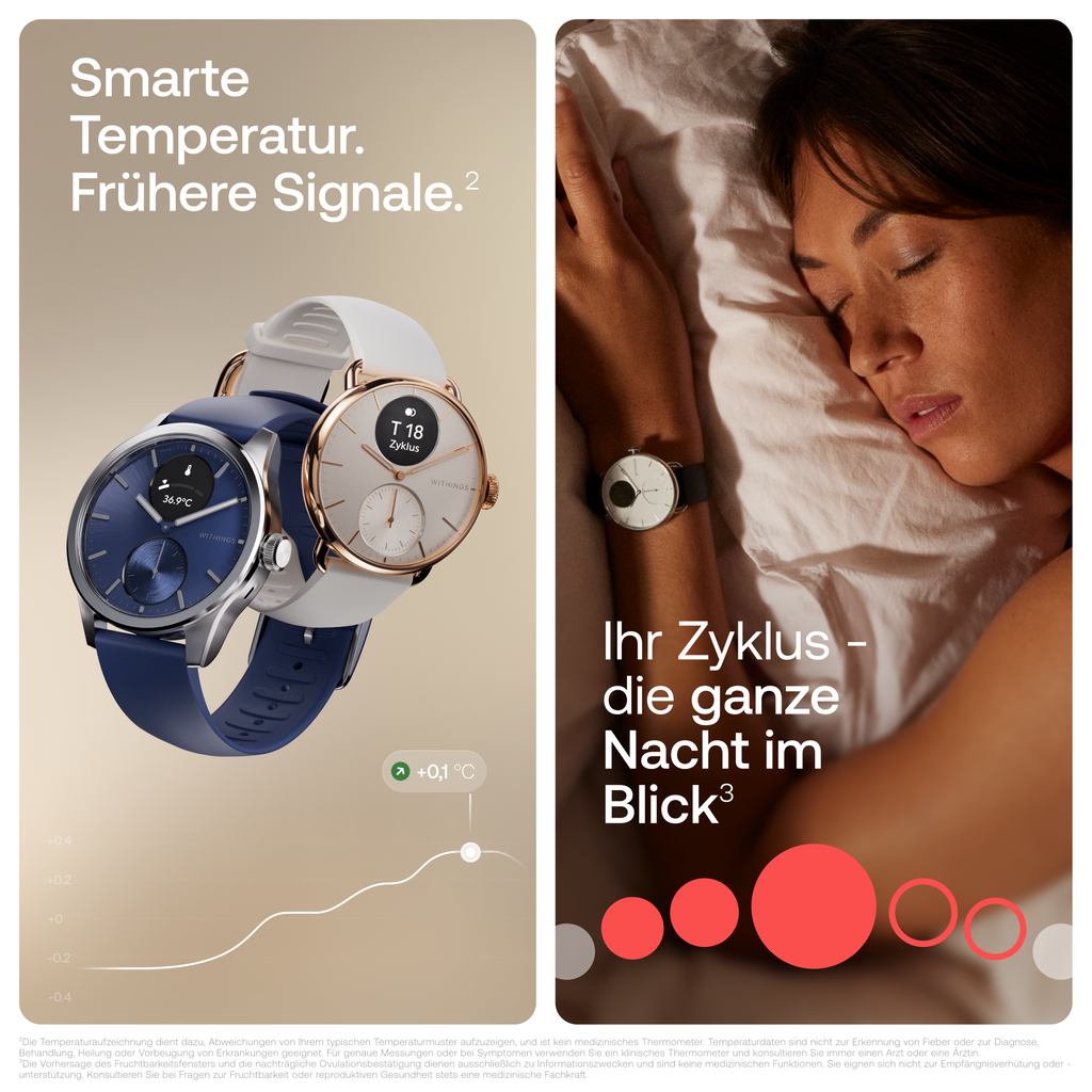 Mit ScanWatch 2 wird die Optimierung Ihrer körperlichen Leistung durch die Trainingszonenfunktion erleichtert. Sie erhalten wichtige Informationen über Ihre sich verändernde Körpertemperatur. Die drei Temperaturzonen wurden sorgfältig festgelegt, damit Sie sie verstehen und für Ihr Wohlbefinden nutzen können: